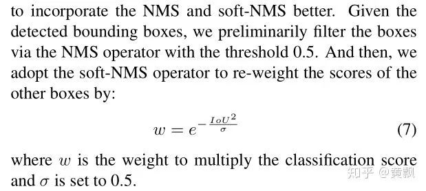 这部分作者的描述方案很“有意思”,作者考虑到NMS和soft-NMS的不足,先利用0.5的IOU阈值做了一次NMS,将靠得比较近的候选框过滤掉了,然后再用基于高斯核的soft-NMS做二次过滤。