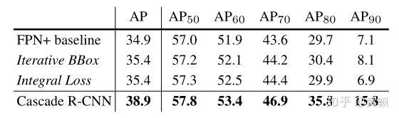 可以看到的是iterative bbox(以不同iou阈值做多次nms)和integral loss(以不同iou阈值并联多个回归和分类过程)都能提升一点点AP,但是Cascade RCNN(以不同iou阈值级联多个回归和分类过程)效果提升最大。