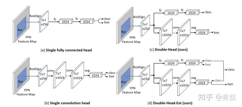 我们可以看到,不同于传统的将回归和分类放在最后阶段,利用两个全连接分支来预测,Double-Head直接从ROI Align之后就将两个人任务分开了,尽可能减少二者共享的特征部分。而Double-Head-Ext方案则是让两个分支都能预测类别和位置。