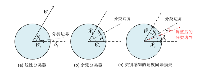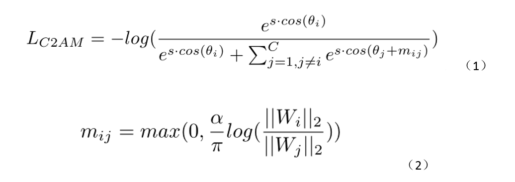 直觉上说,样本丰富度比较小的类别在分类空间中应该占据较小的区域。为了使网络为尾部类别学习到一个更加紧凑和本质的特征表示,我们提出了一种类别感知的角度间隔损失(Category-Aware Angular Margin Loss,C2AM Loss),通过加入与类别相关的自适应的角度间隔来对不同类别间的分类边界进行调整。具体的公式如式(1)(2)所示。