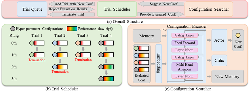 深度神经网络的训练受制于敏感的超参数和不及时的性能评估反馈。针对这两个难点,在深度强化学习的框架下,本文提出了一种高效的并行超参数优化模型,命名为AME。从技术上讲,本文开发了一种注意力和记忆增强结构,能够精准搜索嵌入到巨大搜索空间中的高性能配置。具体地,该结构应用了多头注意力机制和记忆机制,以增强神经网络捕捉不同超参数配置间的短期和长期关系的能力。在AME的优化过程中,本文采用了概念直观但功能强大的Bootstrap策略来解决由于性能评估反馈不及时而导致的样本数量不足的问题。最后,在图像分类、目标检测、语义分割这三个视觉任务上进行实验,证明了AME的有效性。