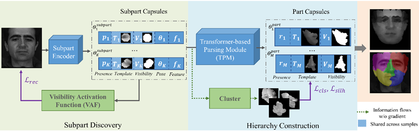 在本文中,我们提出了一种层级解析胶囊网络(HP-Capsule),用于无监督的人脸部件发现。在浏览没有标签的大规模人脸图像时,网络首先使用一组可解释的子部分胶囊对经常观察到的模式进行编码。然后,通过基于Transformer 的解析模块 (TPM) 将子部分胶囊组装成部件级胶囊,以学习它们之间的组合关系。在训练过程中,随着人脸层次结构的逐步构建和细化,部件胶囊自适应地对具有语义一致性的人脸部分进行编码。 HP-Capsule 将胶囊网络的应用从数字扩展到人脸,并向前迈出了一步,展示了神经网络如何在没有人工干预的情况下理解同源对象。