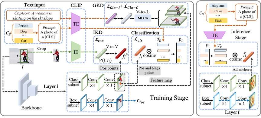为了弥补单阶段方法因缺少类别无关物体候选的这种固有缺陷,我们提出了一种对未见类别物体进行隐式学习的弱监督方法。该方法通过caption与特征图之间的跨模态注意力机制来进行语言到视觉的全局级知识蒸馏。凭借以上方案,我们显著超过了过去最好的开放词汇单阶段检测器。