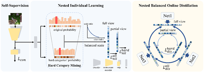 近年来,长尾分布数据的视觉识别问题受到了越来越多的关注。通过大量的实验,我们发现在相同的训练设置,不同的模型初始化下,长尾数据训练出的模型表现出相当大的差异,这体现出了长尾学习中巨大的不确定性。为了减轻这种不确定性,我们提出了一种多专家网络的嵌套式的协同学习方法(NCL),它由两个部分组成,即嵌套个体学习(NIL)和嵌套平衡在线蒸馏(NBOD),前者着重于单个专家网络的学习,后者则帮助多个专家网络传递学到的知识,协同学习。NIL和NBOD都在嵌套的关系中学习,即基于所有类别的全局注意力学习和基于难类别的局部注意力学习。这样的嵌套关系来自于我们提出的简洁有效的难类别挖掘模块(HCM)。对于网络的输出分数,HCM仅选择部分拥有高分数的难类别作为网络训练的负类别,这样便构建出了嵌套关系中的局部注意力。通过NCL,网络的学习彼此嵌套、互补,这样不仅有利于网络捕捉到全局且鲁棒的特征,还提升了网络对更细粒度信息的区分能力。除此之外,自监督也被应用到其中,加强特征的学习。该方法在长尾数据库CIFAR-10/100-LT, Places-LT, ImageNet-LT和 iNaturalist 2018上都取得了目前最好的性能。