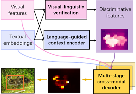 本文提出了一个基于transformer的框架,通过建立文本关联的判别性特征和多阶段跨模态推理来实现准确的视觉定位(visual grounding)。具体来说,我们设计了一个视觉-语言验证模块(visual-linguistic verification module),使视觉特征关注于文本描述相关的区域,并抑制其它无关区域。同时我们还设计了一个语言指导的特征编码器(language-guided feature encoder)来聚合目标的视觉上下文,提高其特征辨别性。为了从建立的视觉特征中检索出目标,我们进一步提出了一种多阶段的跨模态解码器(multi-stage cross-modal decoder)来迭代推理图像和语言之间的相关性,从而准确定位目标。我们在RefCOCO、RefCOCO+和 RefCOCOg数据集上进行了实验,并取得了state-of-the-art的性能。