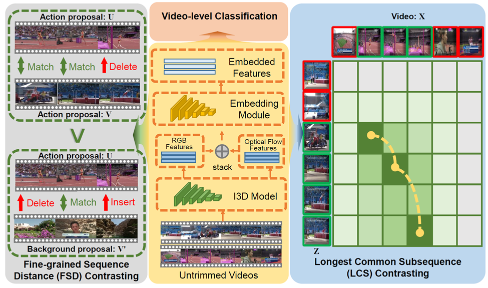 目前,弱监督视频行为定位方法主要遵循于通过优化视频级分类目标来实现定位的方式。这些方法大多忽略了视频之间丰富的时序对比关系,因此在分类学习和分类-定位自适应的过程中面临着极大的模糊性。本文认为通过考虑上下文的序列到序列对比可以为弱监督时序行为定位提供本质的归纳偏置并帮助识别连续的行为片段。因此,如图1所示,本文在一个可导的动态规划框架下,设计了包括细粒度序列距离对比和最长公共子序列对比在内的两个互补的对比目标函数。在多个主流的基准数据集上的实验结果表明本文方法取得了显著的效果。