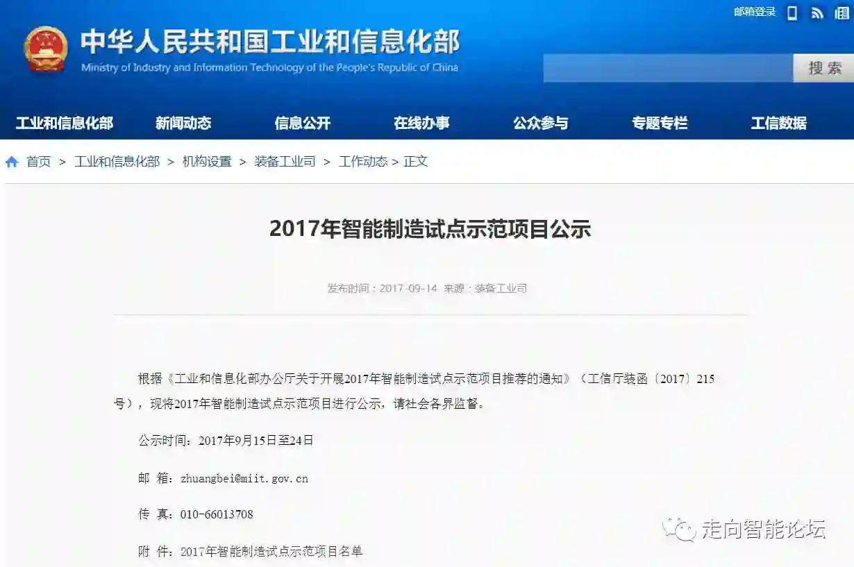 近日,工信部官网公示2017年智能制造试点示范项目。以下为公示全文。本文来自:工信微报,由《走向智能论坛》微信公众号推荐阅读。