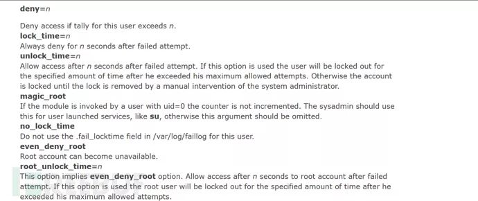 这个的意思也很简单,如果不包含这个参数,则哪怕是root也会增加失败计数,但注意,增加失败计数不代表root就会被锁定,这是两码事。