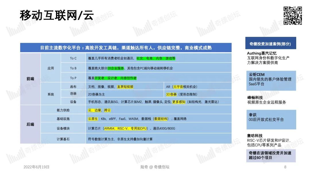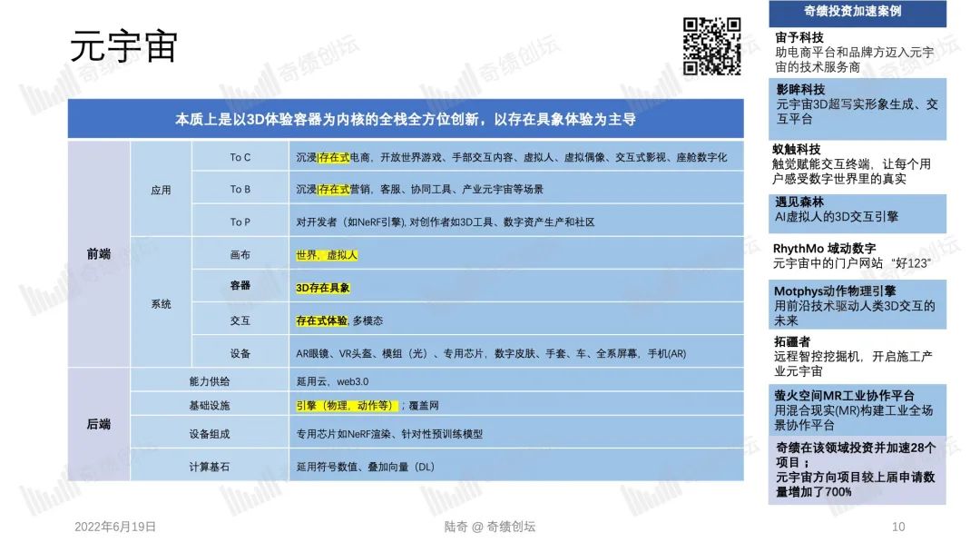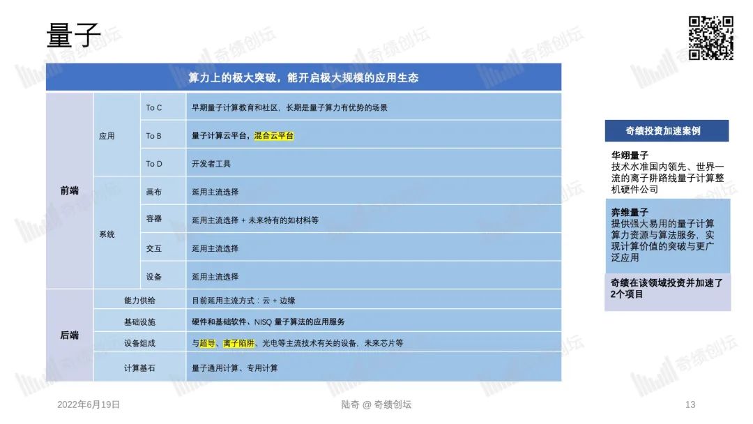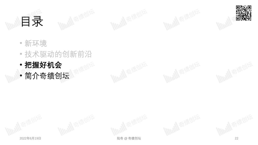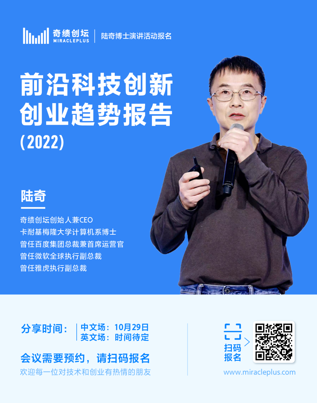 2022 年 10 月 29 日,奇绩创坛将在北京中关村举办年度分享活动。奇绩创坛创始人兼 CEO 陆奇博士将分享 2022 年前沿科技创新创业趋势,分享奇绩从 30000+ 份创业者的申请表里看到的科技创新地图,以及奇绩加速 250+ 科技初创公司后总结的经验。