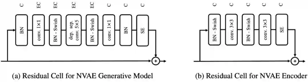 铺垫了这么久,总算能谈到 NVAE 了。NVAE 全称是 Nouveau VAE(难道不是 Nvidia VAE?),它包含了很多当前 CV 领域的新成果,其中包括多尺度架构、可分离卷积、swish 激活函数、flow 模型等,可谓融百家之所长,遂成当前最强 VAE~