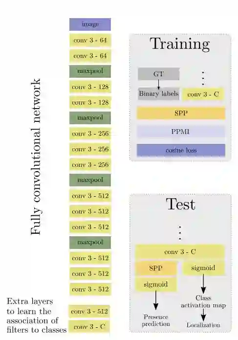 摘要:In this work a novel approach for weakly supervised object detection that incorporates pointwise mutual information is presented. A fully convolutional neural network architecture is applied in which the network learns one filter per object class. The resulting feature map indicates the location of objects in an image, yielding an intuitive representation of a class activation map. While traditionally such networks are learned by a softmax or binary logistic regression (sigmoid cross-entropy loss), a learning approach based on a cosine loss is introduced. A pointwise mutual information layer is incorporated in the network in order to project predictions and ground truth presence labels in a non-categorical embedding space. Thus, the cosine loss can be employed in this non-categorical representation. Besides integrating image level annotations, it is shown how to integrate point-wise annotations using a Spatial Pyramid Pooling layer. The approach is evaluated on the VOC2012 dataset for classification, point localization and weakly supervised bounding box localization. It is shown that the combination of pointwise mutual information and a cosine loss eases the learning process and thus improves the accuracy. The integration of coarse point-wise localizations further improves the results at minimal annotation costs.