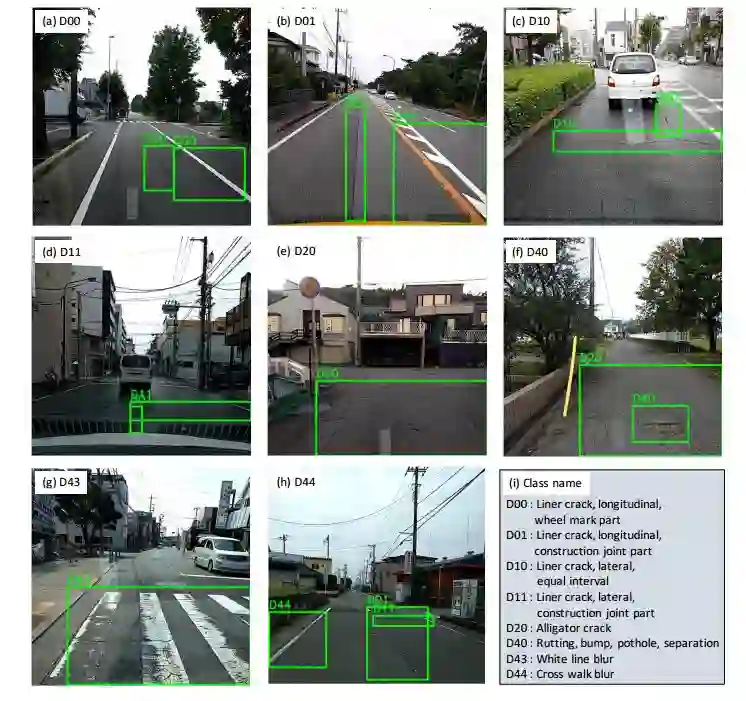摘要:Research on damage detection of road surfaces using image processing techniques has been actively conducted, achieving considerably high detection accuracies. Many studies only focus on the detection of the presence or absence of damage. However, in a real-world scenario, when the road managers from a governing body need to repair such damage, they need to clearly understand the type of damage in order to take effective action. In addition, in many of these previous studies, the researchers acquire their own data using different methods. Hence, there is no uniform road damage dataset available openly, leading to the absence of a benchmark for road damage detection. This study makes three contributions to address these issues. First, to the best of our knowledge, for the first time, a large-scale road damage dataset is prepared. This dataset is composed of 9,053 road damage images captured with a smartphone installed on a car, with 15,435 instances of road surface damage included in these road images. In order to generate this dataset, we cooperated with 7 municipalities in Japan and acquired road images for more than 40 hours. These images were captured in a wide variety of weather and illuminance conditions. In each image, we annotated the bounding box representing the location and type of damage. Next, we used a state-of-the-art object detection method using convolutional neural networks to train the damage detection model with our dataset, and compared the accuracy and runtime speed on both, using a GPU server and a smartphone. Finally, we demonstrate that the type of damage can be classified into eight types with high accuracy by applying the proposed object detection method. The road damage dataset, our experimental results, and the developed smartphone application used in this study are publicly available (https://github.com/sekilab/RoadDamageDetector/).