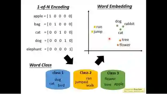 表示词语的含义有许多方法,最简单的是1-of-N encoding,但这个方法可以独立表示每个词,但词与词之间的关联并不能表示出来,并且0-1序列过于庞大了。Word class也是一种方法,将词汇分为不同的类,但这种分类太粗糙了。较好的方法即使今天介绍的work embedding方法,用向量表示每个词汇。