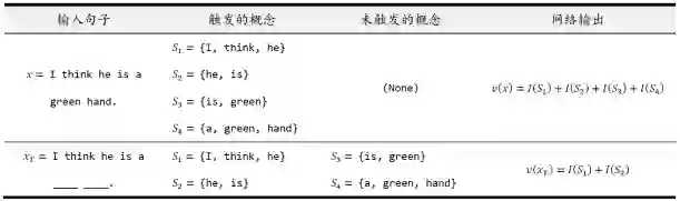 当且仅当 S 中的输入变量全部出现时,这一概念才被触发,从而为网络输出贡献 I (S) 的效用。而当 S 中任意变量被遮挡时,I (S) 这部分效用就从原本的网络输出中移除了。例如,对于 S={a,green,hand} 这一概念,如果把输入句子中的 “hand” 一词遮挡,那么这一概念就不被触发,网络输出中也不会包含这一概念的效用 I (S)。