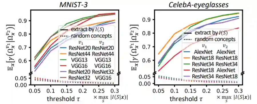 类似地,这些概念应当能够被不同的神经网络稳定地学到,无论是不同初始化的网络,还是不同架构的网络。虽然神经网络可以设计为全然不同的架构,建模不同维数的特征,但是如果不同的神经网络面对同一个具体任务可以实现『殊途同归』,即如果不同神经网络都可以稳定地学习到类似的一组交互概念,那么我们可以认为这组交互概念是面向这个任务的根本的表征。比如,如果不同的人脸检测网络都不约而同地建模了眼睛、鼻子、嘴之间的交互,那么我们可以认为这样的交互是更 “本质的”“可靠的”。在实验中,我们发现,越显著的概念越容易被不同的网络同时学到,相对比例的显著交互是被不同神经网络所共同建模的。