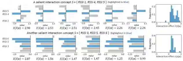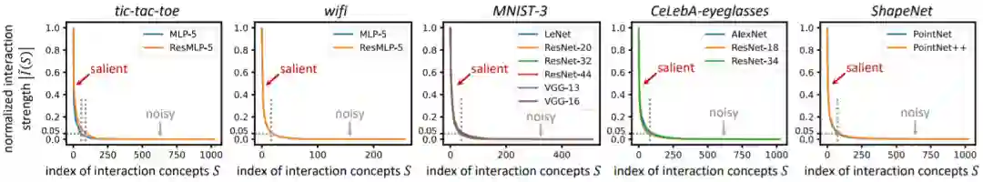 不同于连结主义,符号主义的一个特性在于人们希望用少量的、稀疏的概念来表示网络学到的知识,而不是用大量、稠密的概念。实验中我们发现,在大量潜在概念中,仅有非常少量的显著概念。即大部分交互概念的交互效用 I (S) 趋近于 0,故可以忽略,仅有极少量的交互概念有较显著的交互效用 I (S),这样神经网络的输出仅仅决定于少量概念的交互效用。换句话说,神经网络对于每个样本的推断可以被简洁地解释为少量显著概念的效用。
