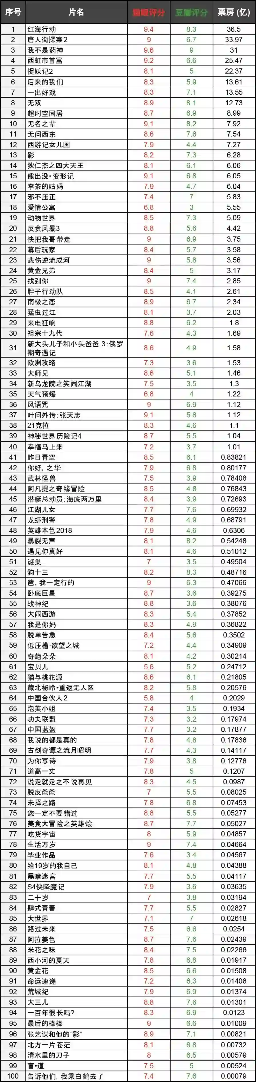 所以,我选用了「一起拍电影」评出的 2018 年度评分最高的 100 部院线电影,并按照票房做了排序,比较了两个平台不同的评分。