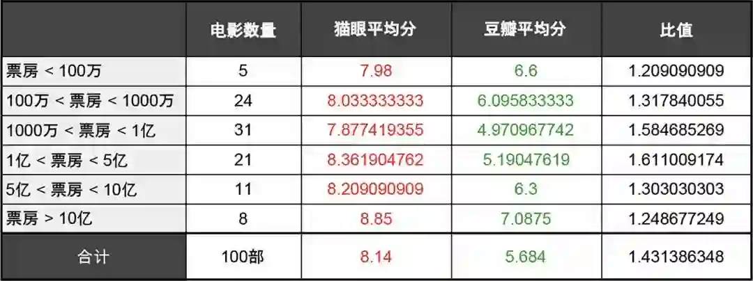 100 部电影,猫眼的平均分是 8.1 分,豆瓣的平均分是 5.7 分,比值约为 1.4。
