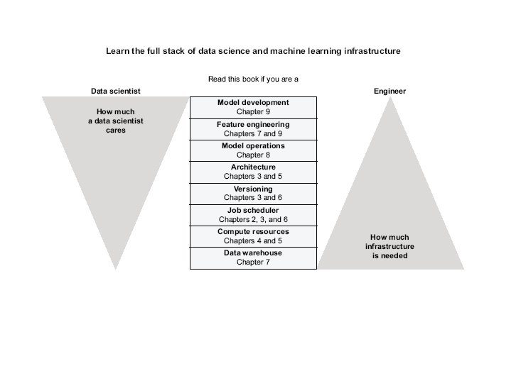 机器学习和数据科学应用是人类构建的最复杂的工程产品,如果你考虑到驱动它们的全部软件和硬件堆栈的话。因此,在今天,在21世纪20年代初,构建这样的应用并不容易,这就不足为奇了。机器学习和数据科学将继续存在。由高级数据驱动技术驱动的应用程序在各个行业中越来越普遍。因此,显然需要使构建和操作这样的应用程序成为一个更轻松、更有纪律的过程。引用阿尔弗雷德·怀特黑德的话:“文明的进步是通过扩展我们无需思考就能执行的重要操作的数量。”这本书教你如何构建一个有效的数据科学基础设施,它允许用户试验创新的应用,将它们部署到生产中,并不断改进它们,而不需要过多考虑技术细节。没有一种千篇一律的方法可以适用于所有的用例。因此,本书关注的是通用的、基本的原则和组件,这些原则和组件可以在您的环境中以一种有意义的方式实现。
