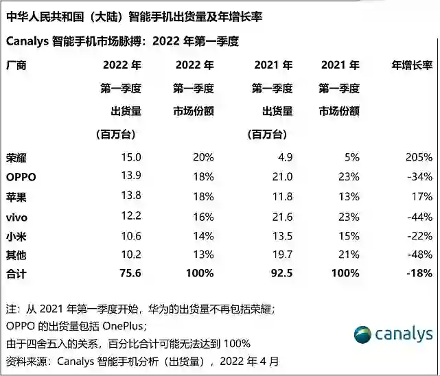 此外,根据 2022 年 4 月份市场调研机构 Canalys 发布的第一季度智能手机销量数据显示,小米在大陆市场出货 1060 万台,同比下降 22%,市场份额从 2021 年第三滑落到第五。