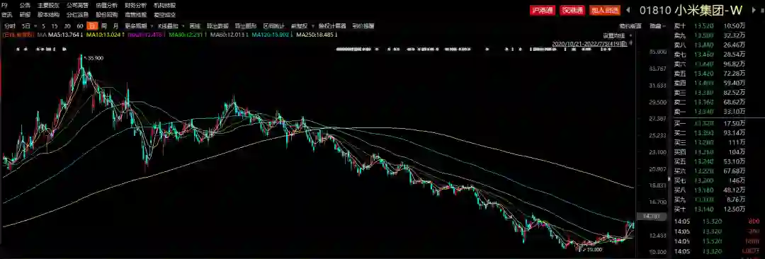 小米面对以上利好的加持,股价也是开启了反弹,可惜好景不长,到 2021 年 6 月 4 日反弹结束,小米股价持续下跌直到现在。
