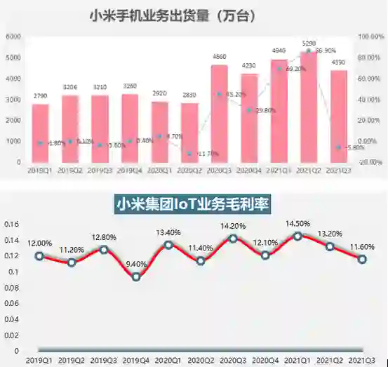 据小米 2021 年三季度报显示,小米手机业务总营收为 478 亿元,同比仅增长 0.5% 。由于核心零部件供应短缺等因素,手机业务的高增长在本季度“戛然而止”,出货量为 4390 万台,同比下降了 5.8%;智能家居业务毛利率为 11.6%,同比下降了 2.6%,环比亦下滑了 1.6% ,呈现连续三个季度下降的态势。