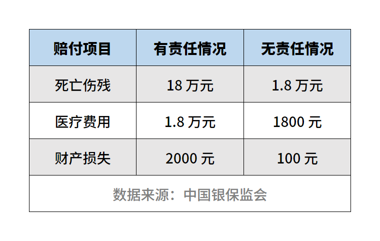 无责任情况下对应的限额分别为 1.8 万元、1800 元和 100 元。