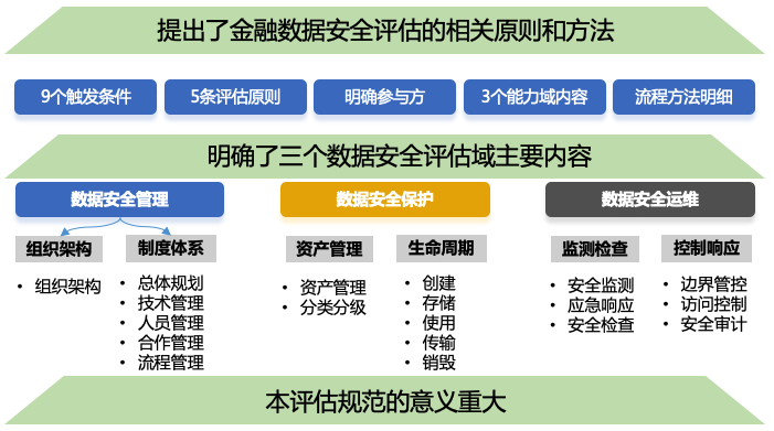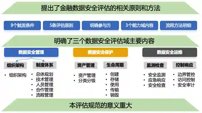 《规范》包括了金融数据安全评估触发条件、原则、参与方、内容、流程及方法,明确了数据安全管理、数据安全保护、数据安全运维三个主要评估域,及安全评估主要内容和方法。该标准适用于金融业机构开展金融数据安全评估使用,并为第三方安全评估机构等单位开展金融数据安全检查与评估工作提供参考。