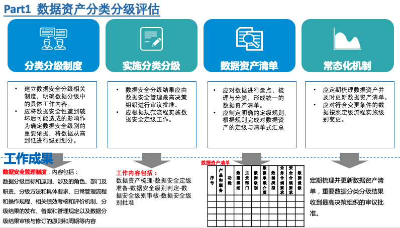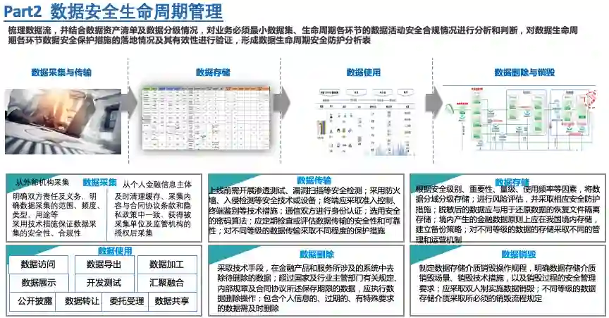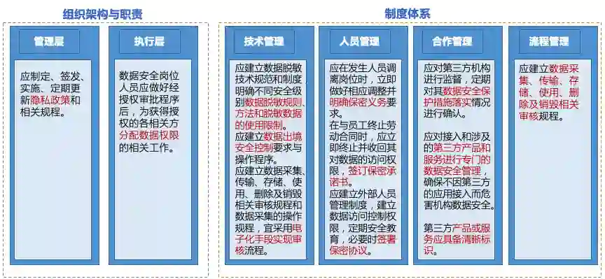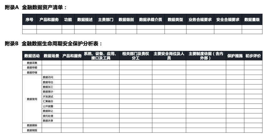 金融数据安全管理:明确了金融业机构数据安全管理相关组织架构及制度体系建设相关安全评估的具体内容、评估方法和结果判定依据。要求建立包括决策层、管理层、执行层以及监督层的完善管理体系,建立能够确保数据安全管理落地的制度体系。