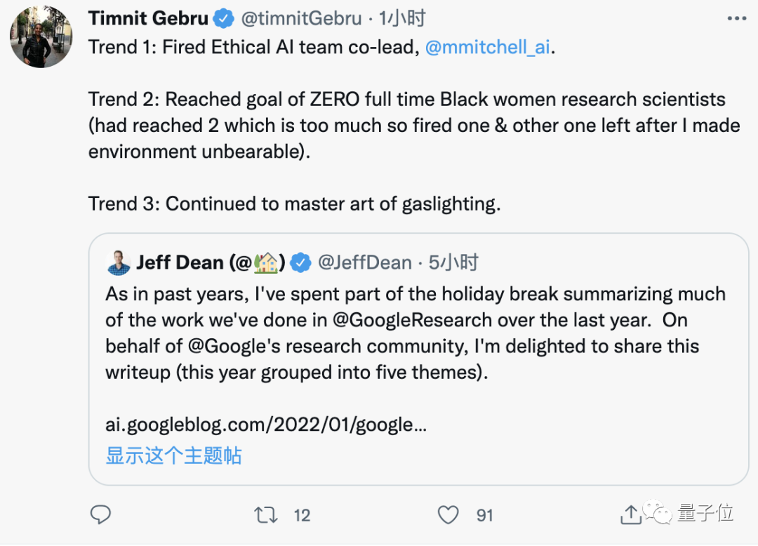 那就是让Jeff Dean陷入歧视风波的那位前员工Timnit Gebru,她也转发了一波~