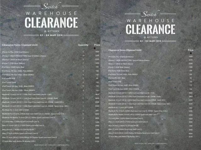 Switch是马来西亚比较著名的苹果经销商之一,1995年发源于槟城,迄今在马来西亚已有30家门店。举行这次清仓活动的分店位于吉隆坡一家位于Mytown的店,且活动不接受网上预定,只接受线下交易。