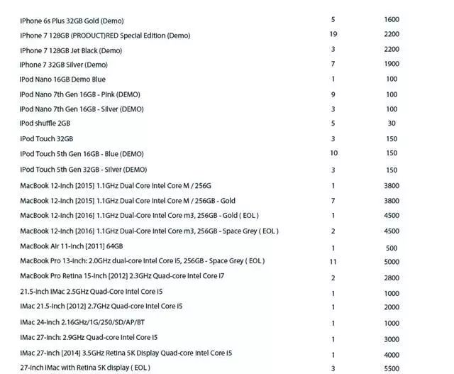 但为时3天的清仓营销,店家只提供了不到200个产品。标价人民币3600元的iPhone7 (128G)只有19个;标价人民币50元只有的 ipod shuffle(2G)只有5个;笔记本电脑的折扣也不小,Macbook Pro retina(2012)需要4500人民币左右,甚至7300元左右就能买一个2016年款的Macbook。但800元左右就能买一个的Macbook Air (64G 2011)只有1个。