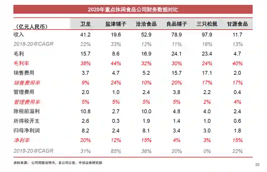 据中信证券报告,卫龙2020年的营收不过41.2亿,但净利润达到8.2亿,净利率20%;作为对比,三只松鼠2020年营收97.9亿,净利润3.0亿,净利率3%。也就是说卫龙食品的营收只有良品铺子、三只松鼠的一半,但是净利润比这两家加起来都多。