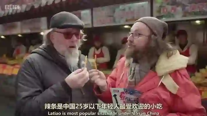 2016年,BBC在中国拍了一部纪录片《中国新年》,介绍中国人的过年习俗。片中两位英国老大爷在大街上买了一大把零食吃,有鱿鱼丝、凤爪、辣条之类。两个人边走边吃边说:“辣条是中国25岁以下年轻人最受欢迎的小吃”。