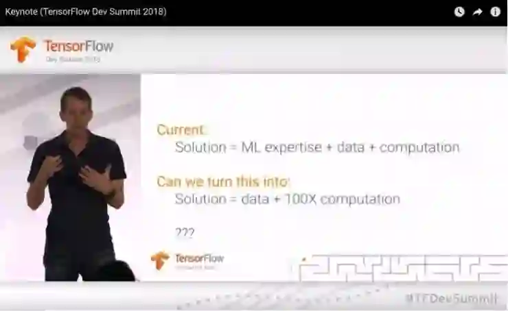 在2018年3月举办的TensorFlow DevSummit大会上,Jeff Dean在主题演讲(大约22:20左右开始)中宣称,未来谷歌可能会用100倍的计算能力取代机器学习专家。 他给出了需要庞大计算力的神经网络结构搜索作为例子(他给出的唯一例子),来说明为什么我们需要100倍的计算能力才能使更多人能够使用ML。