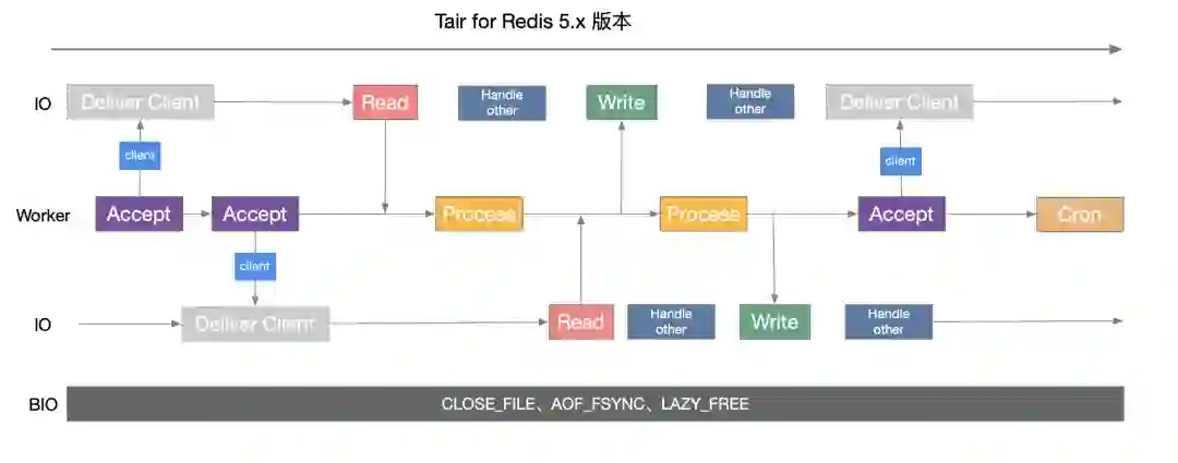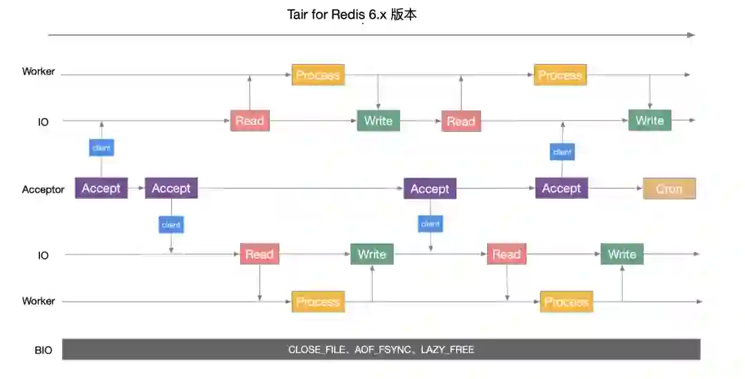 Tair for Redis 5.x 版本当时率先于 Redis 社区实现了多 IO 单 Worker 的形态。该版本将网络 IO 操作从原本的引擎线程中完全剥离,在不同的访问场景下有着相对于社区 150%~300% 的性能提升。