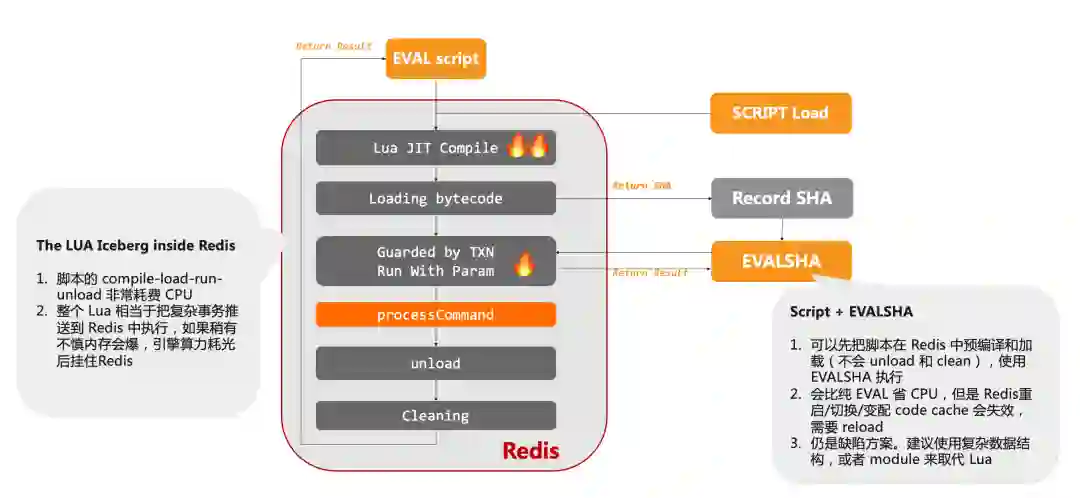 接下来我们聊聊 Lua 机制。Redis 原生的事务(watch-multi-exec)机制只是一种带有 key watch 机制的批量执行手段,实际上和传统数据事务所强调的 ACID 不搭边。Redis 为了弥补自身的一些缺陷,引入了 Lua 作为存储过程的替代实现。Redis 允许用户提交一段 Lua 脚本在服务端执行,并且提供了build-in 的 Lua 库来执行 Redis 命令。得益于一直以来的单线程实现,Lua 脚本在 Redis 服务端是顺序执行的,也就保证了原子性。有了 Lua 这个灵活的机制,Redis 的边界被进一步被拓宽,诸如分布式锁这样的组合特性很快便流行开来。但实际上 Lua 的执行是有额外的开销的,词法分析、语法分析、JIT 以及跨越语言边界的 2 次额外数据类型转换。
