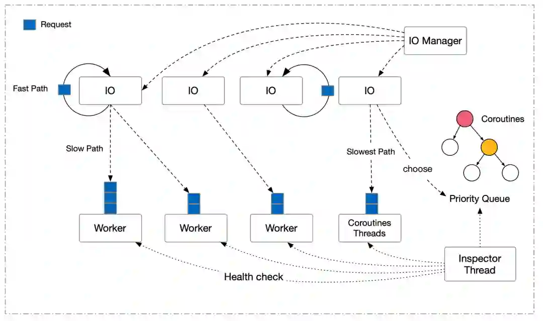 请求被分为 Fast Path,Slow Path 以及可能造成严重阻塞的 Slowest Path 三类。Fast Path 直接在 IO 线程上执行并返回,Slow Path 在单独的 Worker 线程上计算(最后回到 IO 线程上回包),Slowest Path 是引擎的代码估算系统得出的慢速请求,会被投递给专门的 Coroutines Threads 处理。这里重点介绍下 Coroutines Threads,本质上这是一组协程和线程以 M:N 模型进行协作的抽象,每个慢速请求会创建一个新的协程加入到优先队列里被调度执行。使用协程切换的目的是希望慢查询本身也是有优先级的,次慢的查询理应比更慢的查询尽早返回,而不是简单的 FCFS(First Come First Serve)策略。
