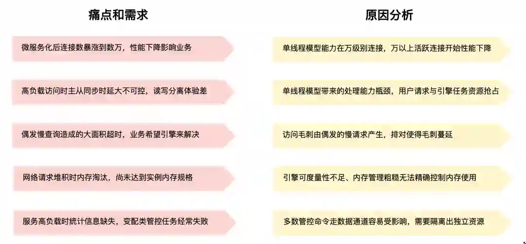 传统 Redis 单线程模式和层出不穷的多线程挑战者之间擦出的火花愈演愈烈,作为耕耘了这个领域近 12 年的 Tair 怎么看待这个架构之争呢?Tair 自研引擎使用的架构也是多线程,这么看来 Tair 认为多线程才是唯一正确的设计吗?当然没这么简单,Tair 做多线程的根因不仅仅是因为单节点的性能问题,更不是单纯为了单节点的跑分去设计实现多线程引擎架构的。去年发布的这篇文章中提到了我们的大客户业务场景下遇到的诸多问题,这里再次引用下文中的部分场景以便于后续的讨论: