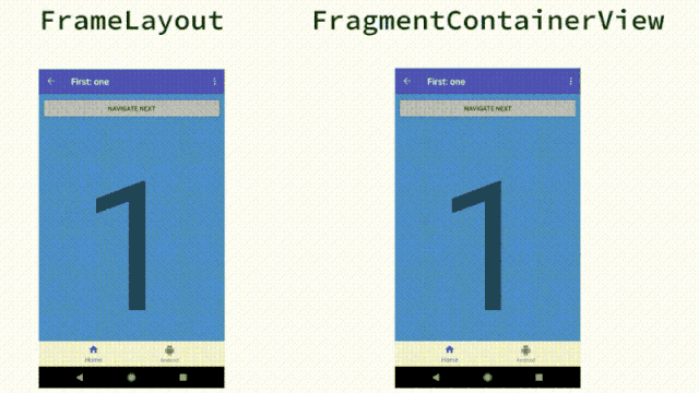 FragmentContainerView 也让我们有机会解决一些动画问题。例如 Fragment 在 Z 轴的层级问题。如下图所示,我们可以看到在 FrameLayout 中,Fragment 切换时没有显示动画,而是整个跳出到了屏幕上。这种问题是由于切入的 Fragment 和它的动画位于之前的 Fragment 的层级之下导致的。而 FragmentContainerView 会确保 Fragment 间的层级关系处于正确的状态,我们就可以看到切换动画了。