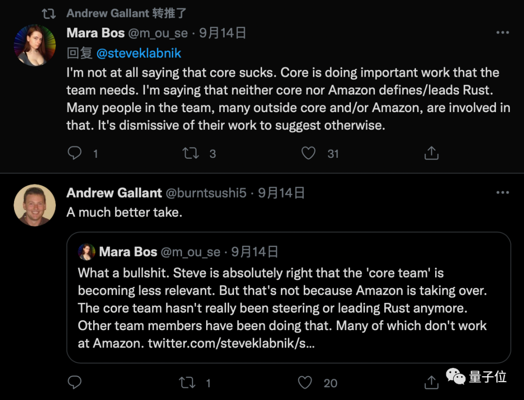 Andrew Gallant最后两条Twitter便是转发Mara Bos的观点。