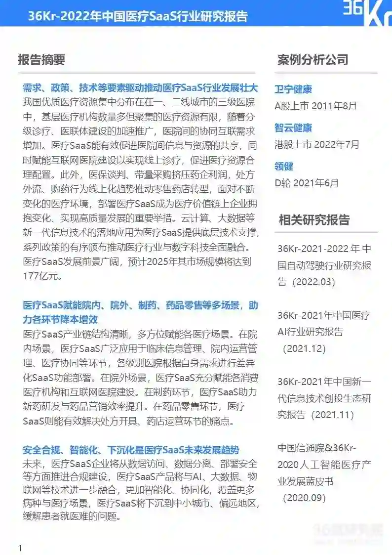更多精彩内容,请关注“36氪研究”微信公众号。如想获取《2022年中国医疗SaaS行业研究报告》,点击文章底部【阅读原文】,提取码:02hw,或在36氪研究院微信公众号上回复“医疗SaaS”获取下载链接。