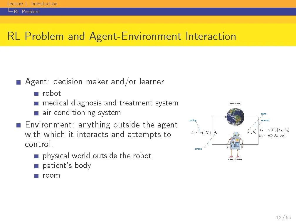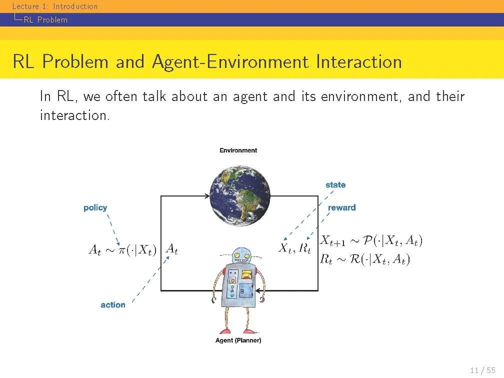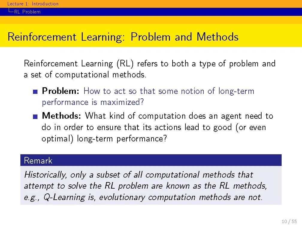 强化学习(RL)既指一类问题,也指解决这类问题的一组计算方法。RL问题是指如何采取行动,使某些长期绩效的概念得到最大化。RL问题,从它的定义来看,是关于一个实体的行为和交互,我们称之为代理,与其周围的环境,我们称之为环境。这是一个非常普遍的目标。有人可能会说,解决AI问题等同于解决RL问题。强化学习也指解决RL问题的一套计算方法。一个代理需要做什么样的计算才能确保它的行为能够带来良好的(甚至是最佳的)长期性能?实现这些的方法称为RL方法。历史上,在所有试图解决RL问题的计算方法中,只有一个子集被称为RL方法。例如Q-Learning这样的方法(我们将在本课程中学习)是一种很好的RL方法,但是进化计算的方法,如遗传算法,则不是。人们可以争辩说,进化计算方法没有太多的“学习”成分,或者它们不以个体生命的时间尺度行事,而是以世代的时间尺度行事。虽然这些是真正的区别,但这种划分方式有些武断。在本课堂讲稿中,我们将重点放在“RL社区”中经常学习的方法上。