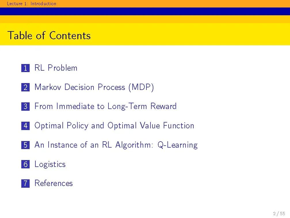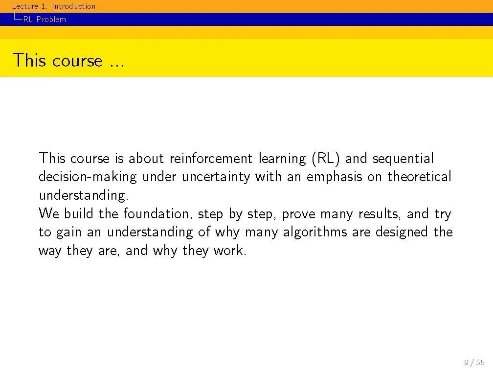 这是一门关于在不确定情况下强化学习(RL)和顺序决策的入门课程,重点在于理解理论基础。我们研究如何使用动态规划方法,如价值和策略迭代,来解决具有已知模型的顺序决策问题,以及如何扩展这些方法,以解决模型未知的强化学习问题。其他主题包括(但不限于)RL中的函数近似、策略梯度方法、基于模型的RL以及平衡探索-利用权衡。本课程将以讲座和阅读古典及近期论文的方式传授给学生。因为重点是理解基础,你应该期望通过数学细节和证明。本课程的要求背景包括熟悉概率论和统计、微积分、线性代数、最优化和(有监督的)机器学习。