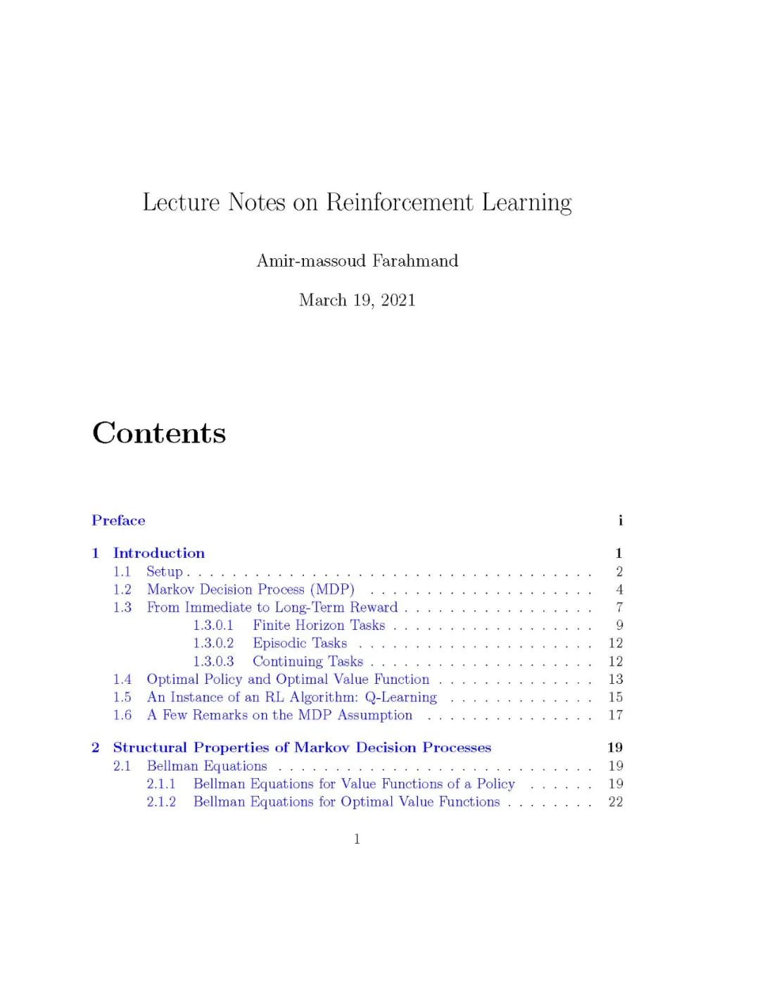 这是多伦多大学计算机科学系于2021年春季教授的强化学习(RL)研究生课程介绍的讲义。本课程是入门性的,因为它不需要预先接触强化学习。然而,它不仅仅是算法的集合。相反,它试图在RL中经常遇到的许多重要思想和概念背后建立数学直觉。在这些讲义的过程中,我证明了很多基础的,或者有时不那么基础的,RL的结果。如果某个结果的证明过于复杂,我就证明一个简化的版本。