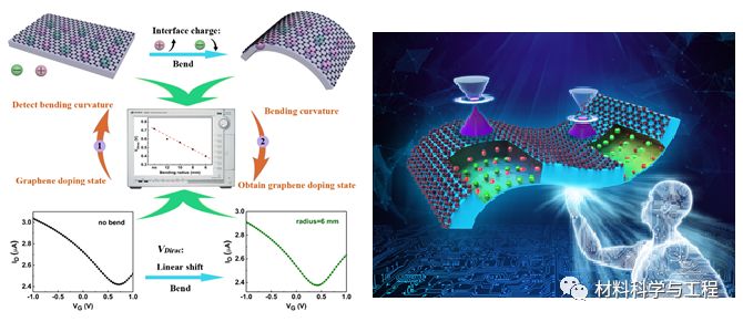 相比于其他调控石墨烯掺杂的方法,本工作避免了杂化掺杂对石墨烯造成的破坏以及化学修饰掺杂带来的其他物质吸附,且为可逆、可控的和柔性的。基于以上优点,全无机柔性石墨烯场效应晶体管不仅可以通过弯曲机械应力调控石墨烯掺杂,而且还可以根据柔性铁电栅GFET的VDirac变化来检测样品的弯曲状态。