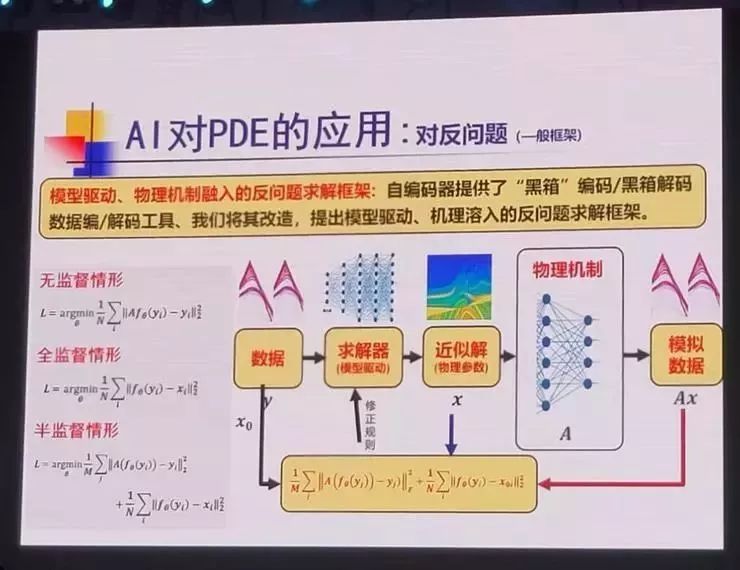 首先是受到编码器的启示,他对自编码器提供的「黑箱」编码、解码以及数据编码、解码的方法进行改造,提出了模型驱动、机理溶入的反问题求解框架,并由此提出解反问题的无监督学习、全监督学习和半监督学习的三种模式都采用这一框架去实现的观点。