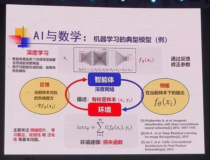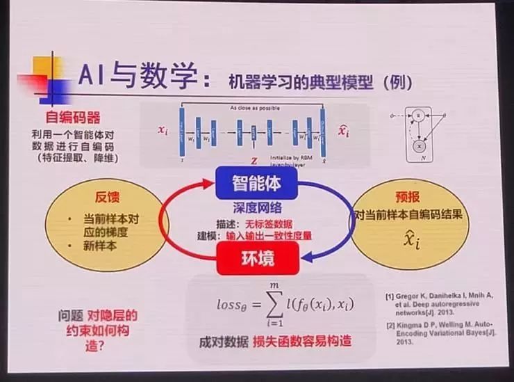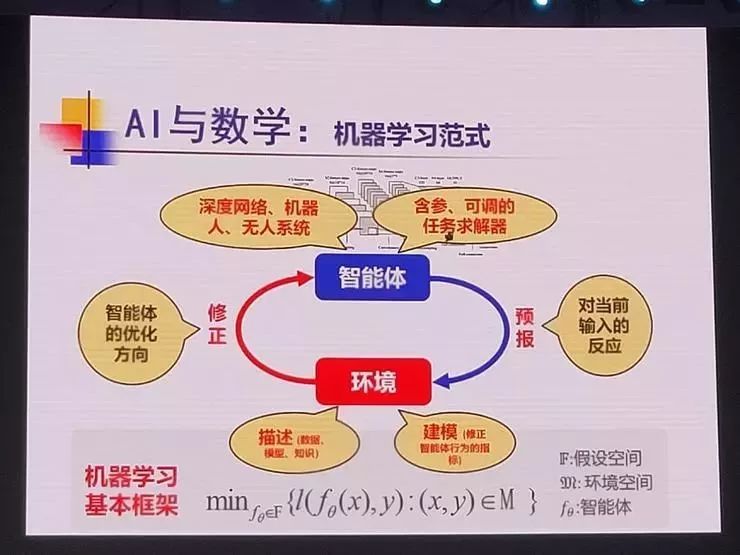 他认为,无论是从机器学习还是数学,二者在解决问题上都可以用上图中的这一框架来描述,其中包括两个最为重要的部分:一个是智能体,一个是环境。