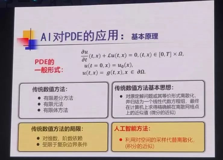 而人工智能对 PDE 问题的应用,同样被徐宗本院士视作人工智能在数学中的成功应用。下图中公式为 PDE 的一般形式:第一行方程式是含导数的关系式;第二行方方程式则是指该函数应该满足的初始条件;第三行方程式方式则表示公式在边界情况下的对应关系。三个方程式合在一起就是微分方程定解问题。