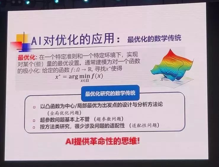 最优化是数学的基本问题,然而数学传统在研究这个问题上有很多的局限性,包括无法实现全局优化、不涉及超参数问题以及适配性问题等,例如在局部优化方面研究得很彻底,但就是没有人研究解决某个「世纪」问题应该用什么方法。而人工智能在这几个问题上的应用,都能带来非常可喜的结果。